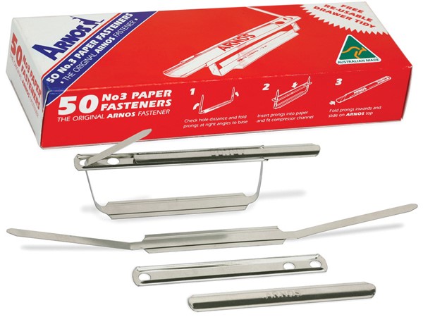 Reliable, metal three piece paper fastener with secure full length top slide to lock prongs securely in place.
