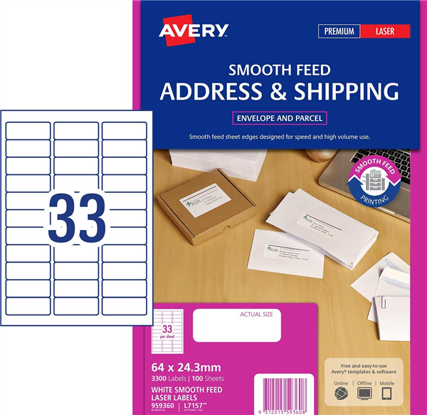Dimensions: 64 x 24.3 mm|Content: 3300 Labels / 100 Sheets|Printer Type: Laser|Software Code: L7157|Adhesive Type: Permanent|Colour: White|Made From: Paper|Format: A4|Eco-friendly: FSC