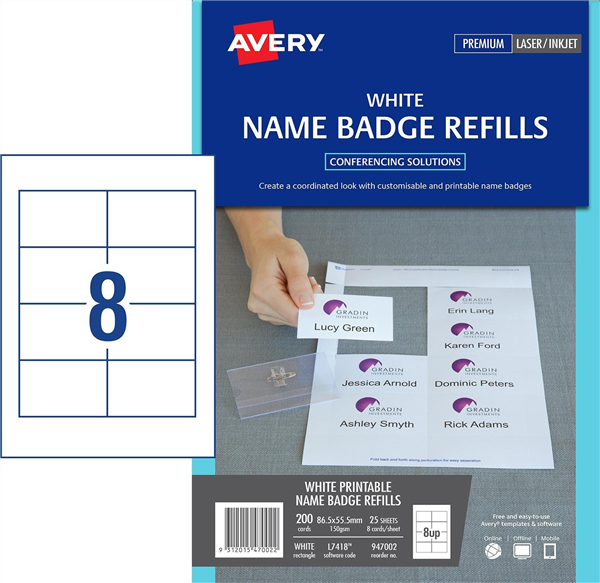 Simply design, print and insert into your existing Avery Name Badge Holders as refills to save on the cost of purchasing new holders every time you hold a new event