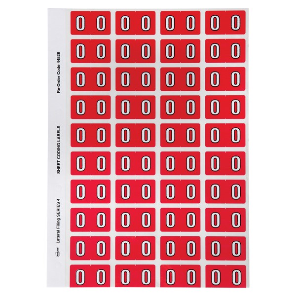 There are 240 red Alphanumeric 0 Side Tab Colour Coding Labels in a pack, size of 25mm x 42mm ready to stick straight onto the side tab of your Avery Lateral Files.