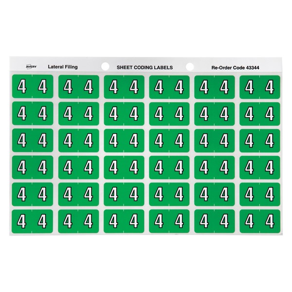 There are 180 light green Numeric 4 Side Tab Colour Coding Labels in a pack with a size of 25 x 38mm ready to stick straight onto the side tab of your Avery Lateral Files.