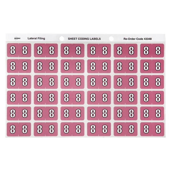 There are 180 mauve Numeric 8 Side Tab Colour Coding Labels in a pack with a size of 25 x 38mm ready to stick straight onto the side tab of your Avery Lateral Files.