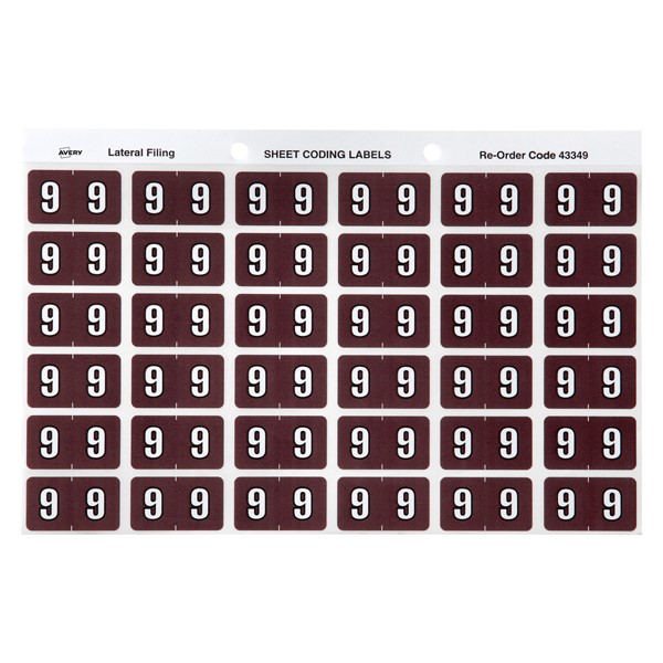 There are 180 brown Numeric 9 Side Tab Colour Coding Labels in a pack with a size of 25 x 38mm ready to stick straight onto the side tab of your Avery Lateral Files.
