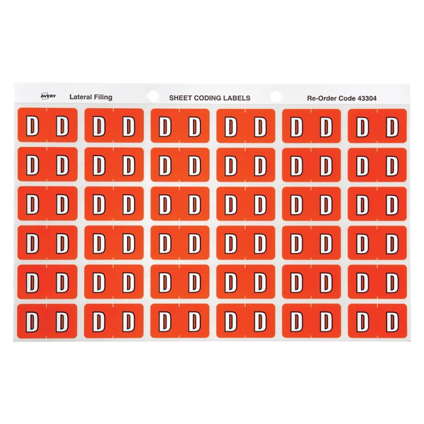 There are 180 dark orange Alphabetical D Side Tab Colour Coding Labels in a pack with a size of 25mm x 38mm ready to stick straight onto the side tab of your Avery Lateral Files.