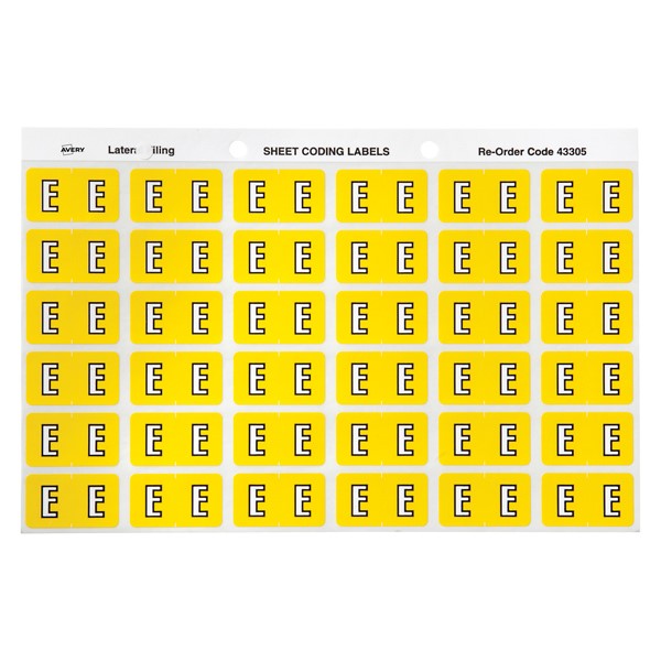 There are 180 yellow Alphabetical E Side Tab Colour Coding Labels in a pack with a size of 25mm x 38mm ready to stick straight onto the side tab of your Avery Lateral Files.
