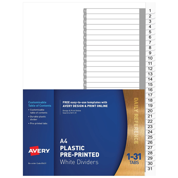 Avery Dividers Pre Printed 1 to 31 Tabs White Set