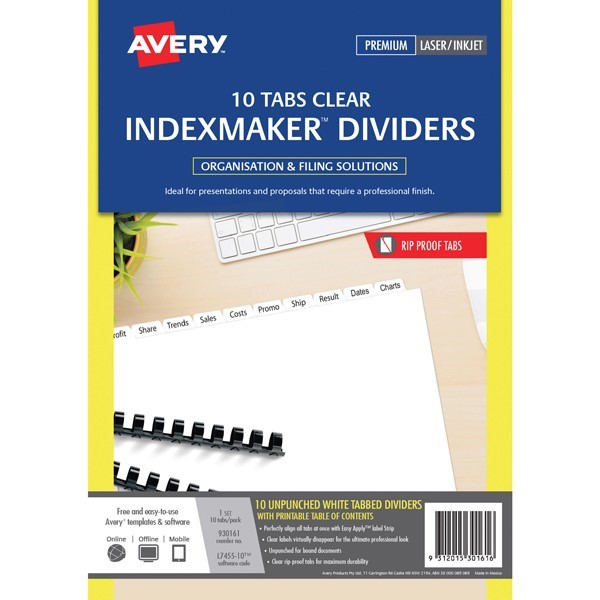 Create professional looking presentations for client proposals, customer presentations, training guides, manuals and more with Avery Print & Apply customisable dividers with clear Easy Apply tab labels that virtually disappear when applied for a professional finish