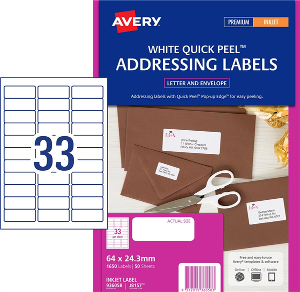 Avery J8157 Inkjet Address Labels 64*24.3 33 Up Pk50