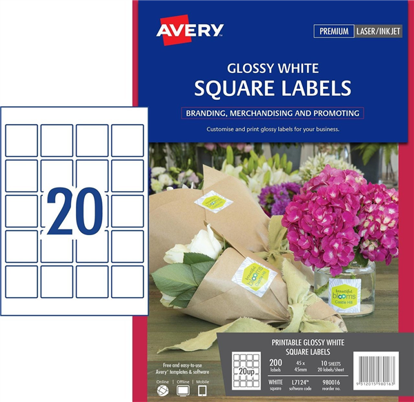 Avery L7124 Labels Square 20UP Glossy White 10 Pack