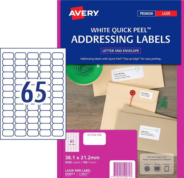 The label format is 38.1 x 21.2mm with 65 labels per sheet and is an ideal size for return address labels.