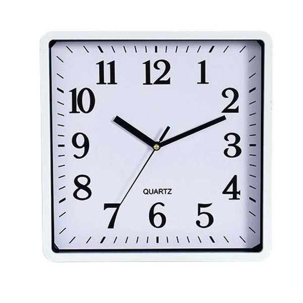 This square wall mounted clock has an analogue movement