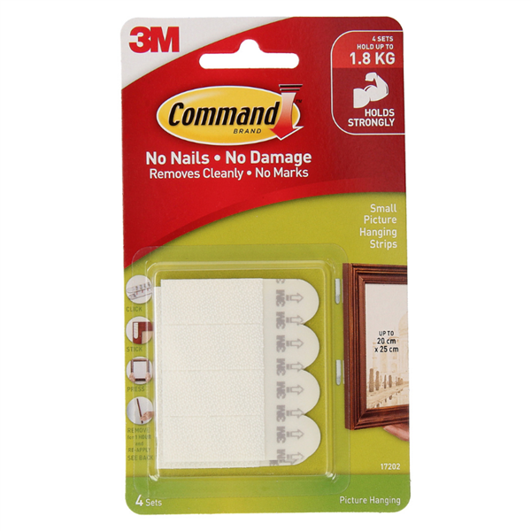 Command Small Picture Hanging Strips hold up to 1.8kg 4 sets of strips and are designed for hanging frames without hanging hardware ie no sawtooth or wireback attachments, nor back of frame stands found on desk top frames stand needs to be removed to use Command Picture Hanging Strips