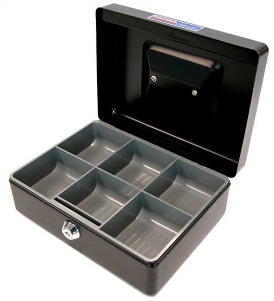 Features a handle that folds neatly into a recess when not in use, a secure cylinder lock with two keys and a partitioned coin tray.