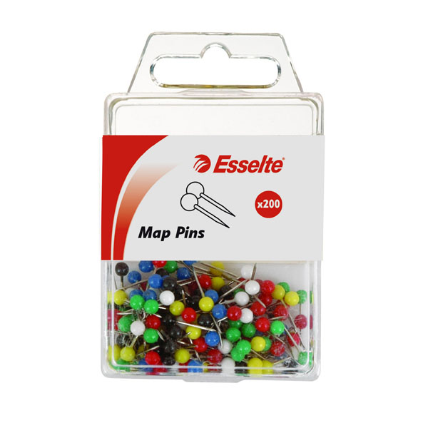 Esselte map pins are ideal for pin pointing or highlighting an area, tacking posters, menus or charts to walls, cork boards or porous surfaces.