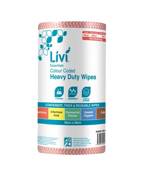 The Livi red commercial wipes has 90 sheets per roll & is perforated for controlled usage.