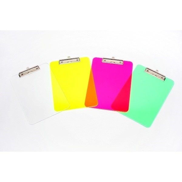 Bright plastic clipboards with quality metal clips and retractable hanging hook