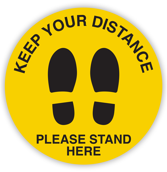 Sign Keep Your Distance 1.5m Please Stand Here in Circular Shoe Prints