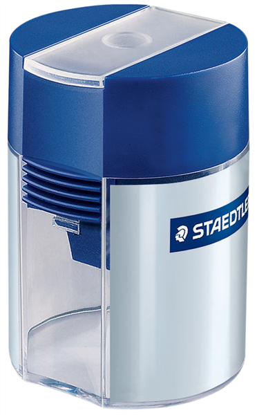Features STAEDTLER's metal sharpener insert, a hinged cover to prevent the shavings from spilling and a safety lock on the lid to avoid accidental opening.