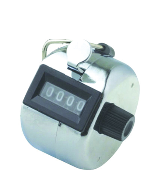 Four digit, stainless steel tally counter with the capacity to count to count up to 9,999.
