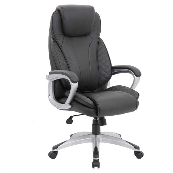 The chair has silver fixed arms with padding, PU leather throughout and a free float or lock mechanism